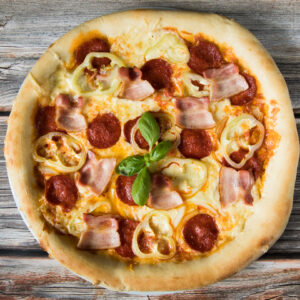 (paradicsomszósz, sajt, sonka, gomba, szalámi, kukorica, csemege pepperoni, hagyma) 1 adag Rántott hagymakarika, 1 db választható üdítő (0, 33l), 1 adag mártogatós