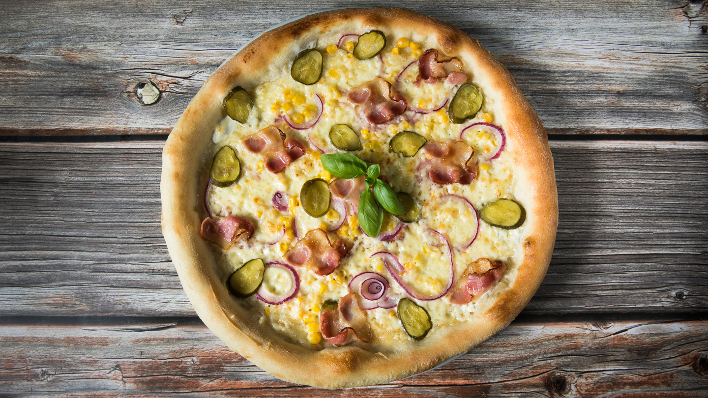 mustáros-tejfölös alap, kukorica, csemege uborka, lila hagyma, sajt, bacon