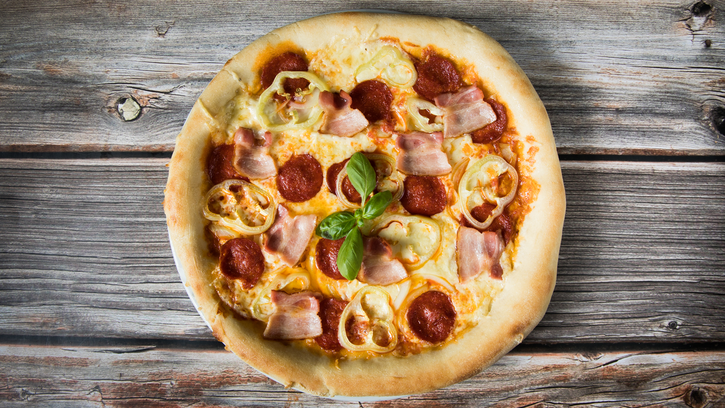 paradicsomszósz, hagyma, sajt, csípős szalámi, bacon, paprika