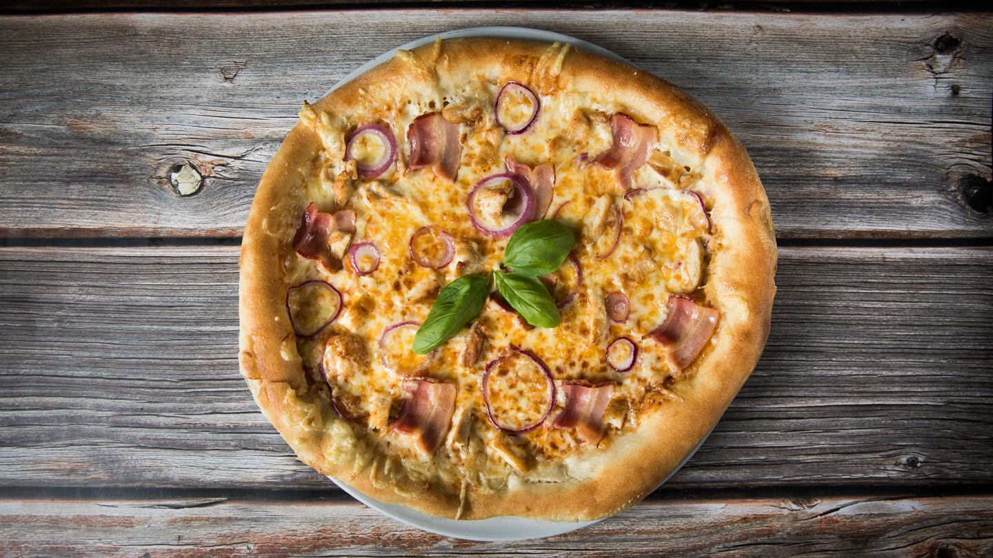 (BBQ alap, bacon, csirkemell kockák, lila hagyma, mozzarella) 1 adag Rántott hagymakarika, 1 db választható üdítő (0, 33l), 1 adag mártogatós