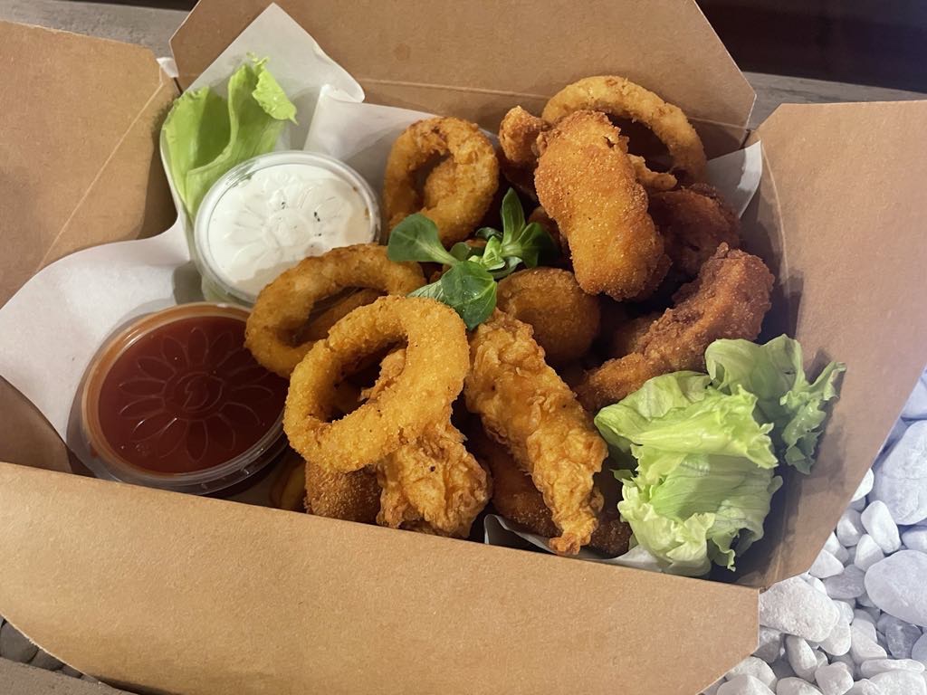 6 db rántott csirkemell csík, 6 db párizsibundás csirkemellcsík, 4 db rántott hagymakarika, 2 adag  választható szósz, kis hasábburgonya