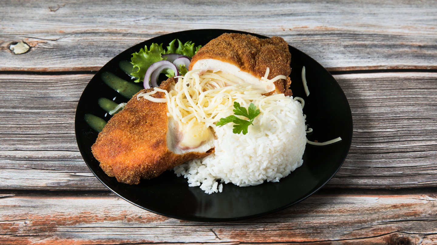 Rántott csirkemell csípős szalámival, jalapeño paprikával és füstölt sajttal töltve.