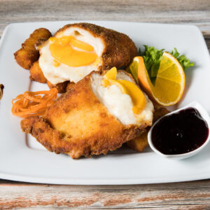 Original price was: 3.450 Ft.3.150 FtCurrent price is: 3.150 Ft.MegnézemRántott csirkemell őszibarackkal és sajttal töltve, külön meggylekvárral kínálva.