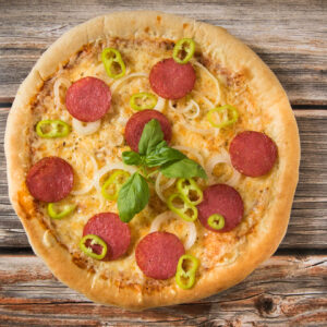 paradicsomszósz, sajt, szalámi, hagyma, hegyes erős paprika, csípős szósz