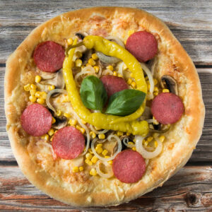paradicsomszósz, sajt, sonka, gomba, szalámi, kukorica, csemege pepperoni, hagyma