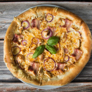Original price was: 3.850 Ft.3.350 FtCurrent price is: 3.350 Ft.MegnézemBBQ alap, bacon, roston csirkemell kocka, lila hagyma, mozzarella